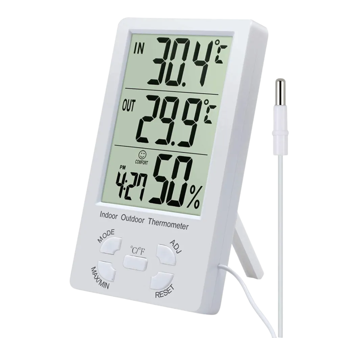 2-in-1 LCD-Digitalthermometer und Hygrometer für den Innen- oder Außenbereich. Die Wetterstation zeigt die Luftfeuchtigkeit und Raumtemperatur für ein gutes Klima an. Das Thermometer ist für eine einfache und schnelle Montage konzipiert, es kann leicht an der Wand aufgehängt oder auf dem Schreibtisch stehen. Das große und übersichtliche Display ermöglicht es Ihnen, die Daten schnell und genau abzulesen. Kann zur Aufzeichnung von Innen- und Außentemperatur sowie Luftfeuchtigkeit verwendet werden. Ein Kabel mit Sonde ist an der Wetterstation zum Messen der Außentemperatur angebracht. SPEZIFIKATIONEN: