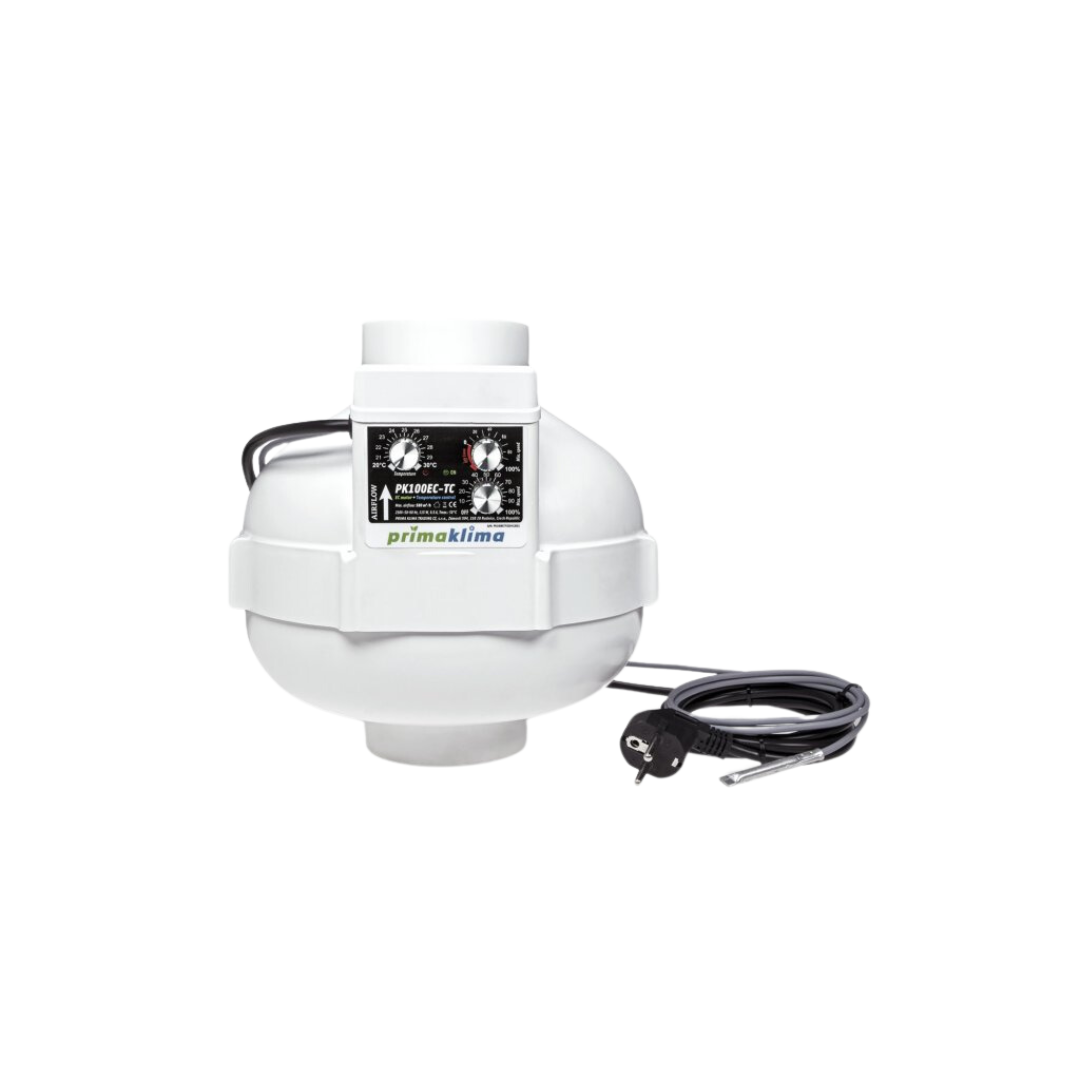 Prima Klima EC-TC (Mit Temp Steuerung) ist ein äußerst effizienter Inline-Kanalventilator, ausgestattet mit einem Premium ZIEHL-ABEGG-Motor mit sehr niedrigem Stromverbrauch. Das Gerät ist extrem leise und energieeffizient dank der EC-Technologie. Mit der mitgelieferten Montagehalterung kann der Ventilator einfach und sicher in jeder Position an Wand oder Decke befestigt werden. Prima Klima ist ein sehr energieeffizienter Inline-Kanalventilator aus schlagfestem und langlebigem Polyamid (Nylon) mit sehr niedrigem Stromverbrauch. Funktionen:- Premium ZIEHL-ABEGG-Motor