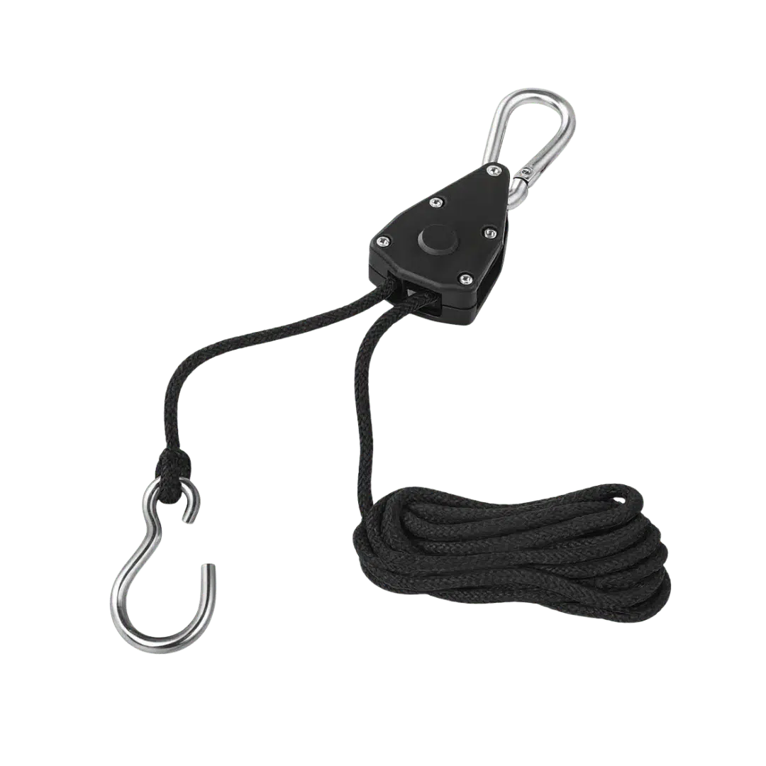 Kurz gesagt: Ein robustes und benutzerfreundliches Rope-Ratchet mit praktischem Metallhaken unten und Karabinerhaken oben – eine einfache, aber äußerst effektive Lösung zur sicheren Aufhängung deines Grow-Equipments.