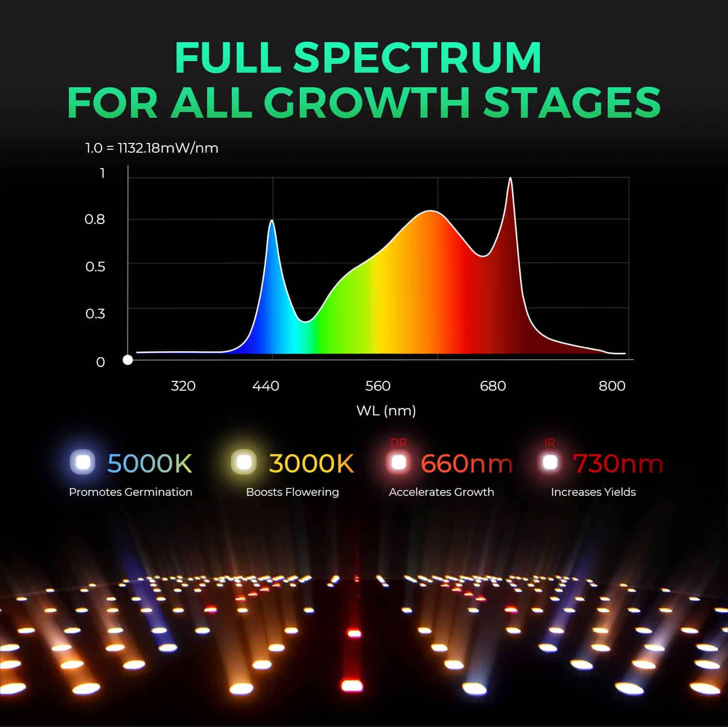 Mit dem fortschrittlichen Spektrum kombiniert die SP3000 Greenhouse rote, blaue und Vollspektrum-LEDs, sodass Pflanzen das optimale Licht für alle Wachstumsphasen erhalten. Das verbesserte Design sorgt für einen höheren PPFD und eine stärkere Penetration durch das Blätterdach.